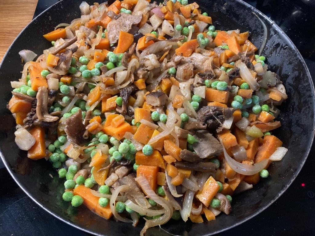 - Dans une grande poêle, faire suer les champignons. Une fois l'eau évaporée, ajouter deux cuillères à soupe de graisse de canard, les carottes, le potimarron, les navets. Saupoudrer avec les épices et l'ail finement ciselée. Saler. Cuire à couvert à feu moyen 20-25 minutes. Remuer régulièrement.